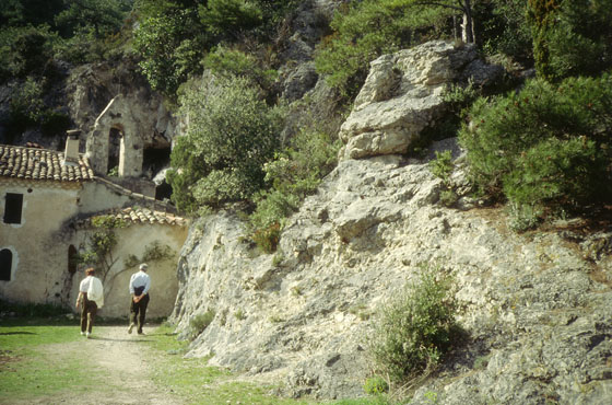 C’est après une bonne heure de grimpette, dans la garrigue caillouteuse et parfumée que l’on atteint cet endroit de retraite singulier.